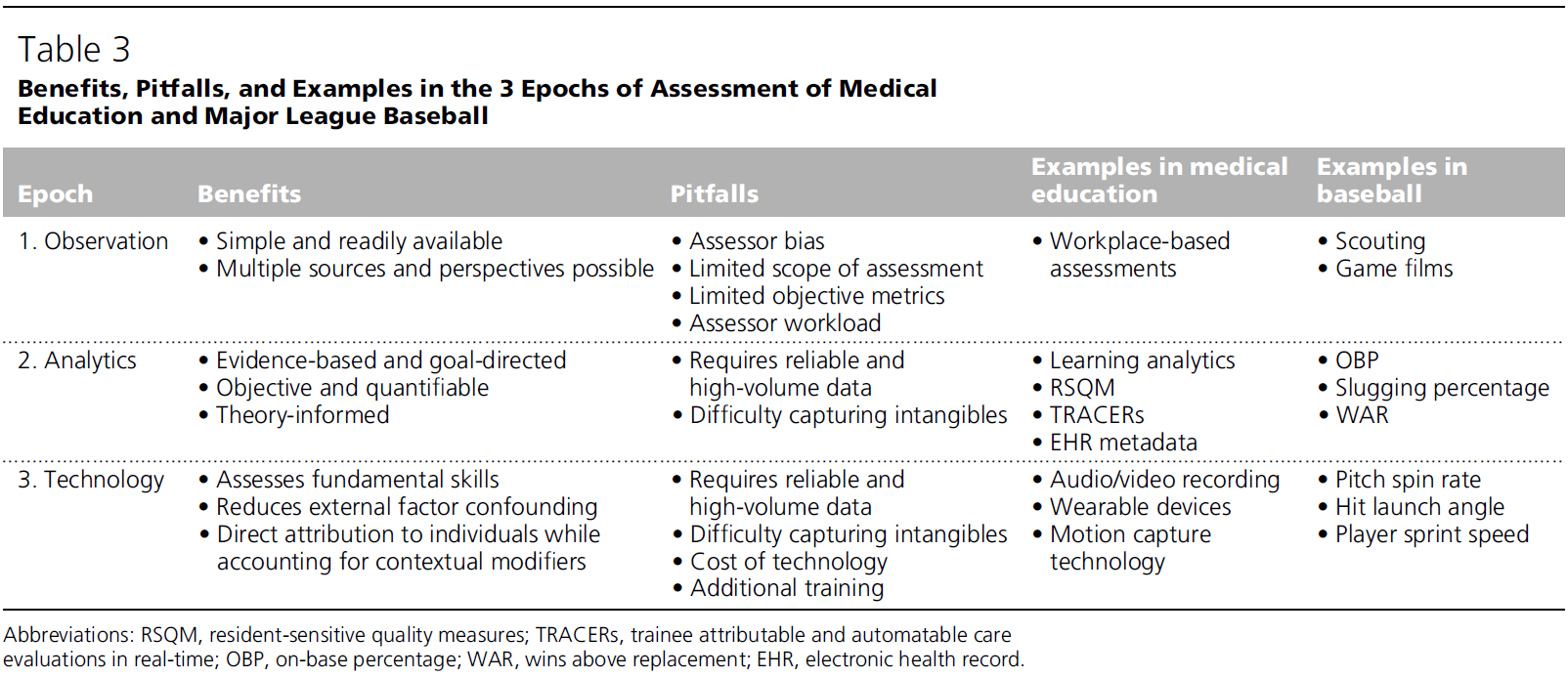 표 3 - 의학교육과 메이저 리그 베이스볼 평가의 3가지 시대별 이점, 함정 및 예시 (Benefits, Pitfalls, and Examples in the 3 Epochs of Assessment of Medical Education and Major League Baseball)