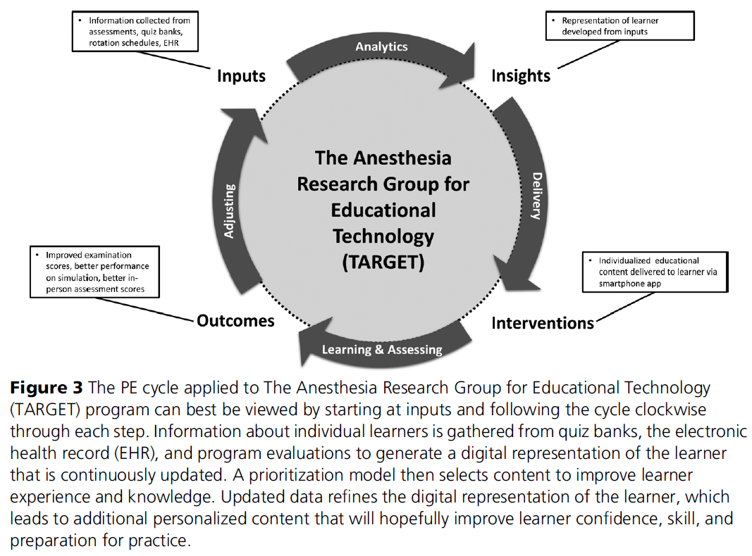 교육 공학을 위한 마취 연구 그룹(The Anesthesia Research Group for Educational Technology, TARGET)은 마취과 전공의에게 개별화된 교육을 제공하기 위한 자동화 도구를 개발하는 것을 목표로 하는 다기관 컨소시엄입니다. TARGET 팀은 Triola와 Burk-Rafel이 제시한 P4 프레임워크에 기반하여 이 PE 플랫폼의 개념적 설계를 공식화했으며, 여기에는 능동성(proactivity), 개인화(personalization), 참여(participation), 성과의 예측(prediction of outcomes) 원칙이 포함됩니다. 이 프레임워크는 PE 주기를 사용하여 실행됩니다(그림 3 참조).