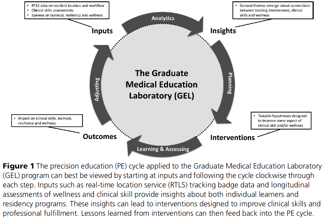 졸업 후 의학 수련생(Graduate medical trainees)들은 현대 병원에서 환자와 직접 접촉하는 시간이 12%에 불과합니다. 이는 임상 기술(clinical skills)의 저하, 의료 오류(medical errors)의 증가, 의료 제공자 사이의 소진(burnout) 증가와 동시에 발생했습니다. 전공의 교육 연구실(The Graduate Medical Education Laboratory, GEL)은 졸업 후 의학 수련생(즉, 전공의, 그림 1 참조)의 임상 기술과 직업적 성취감(professional fulfillment)을 향상시키기 위해 헌신하는 4개 내과 전공의 프로그램(존스 홉킨스 병원, 존스 홉킨스 베이뷰 의료 센터, 스탠포드 대학교, 앨라배마 대학교 버밍엄)의 네트워크입니다. GEL의 목표는 다음과 같습니다:
