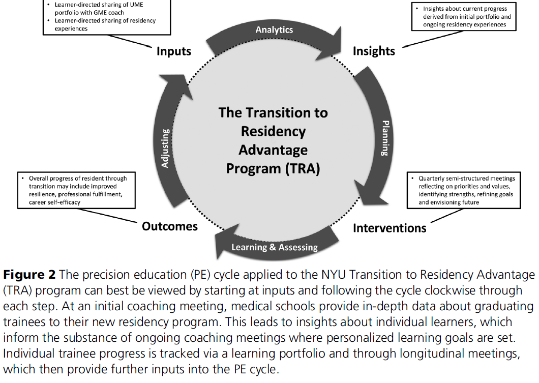 의과대학에서 전공의 과정(residency)으로의 전환은 학습자의 발전과 안녕(well-being)을 위협하는 힘든 시기입니다. 수련생들이 점차 다양해짐에 따라, 천편일률적인 접근 방식(one-size-fits-all approach)은 학습 요구의 폭넓은 편차를 지원할 수 없습니다. 의과대학은 학생의 성과에 대한 풍부한 포트폴리오를 수집하지만, 선발 과정 중이나 그 이후에 졸업 후 수련 프로그램(graduate training programs)에 제공되는 정보는 거의 없습니다. NYU의 전공의 전환 이점(Transition to Residency Advantage, TRA) 프로그램은 전공의 과정으로의 전환을 개선하기 위해 코칭(coaching)에 기반을 둔 PE 접근 방식을 사용합니다(즉, 브리지 코칭; 그림 2 참조).
