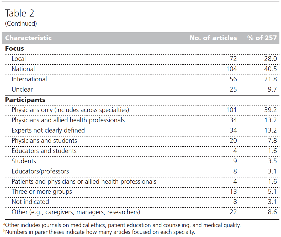 - 25편의 논문(9.7%)에서는 초점이 지역적, 국가적, 또는 국제적인지 불분명했습니다. 연구들은 매우 다양한 전문 분야(specialties)에서 수행되었습니다(Table 2 참조).