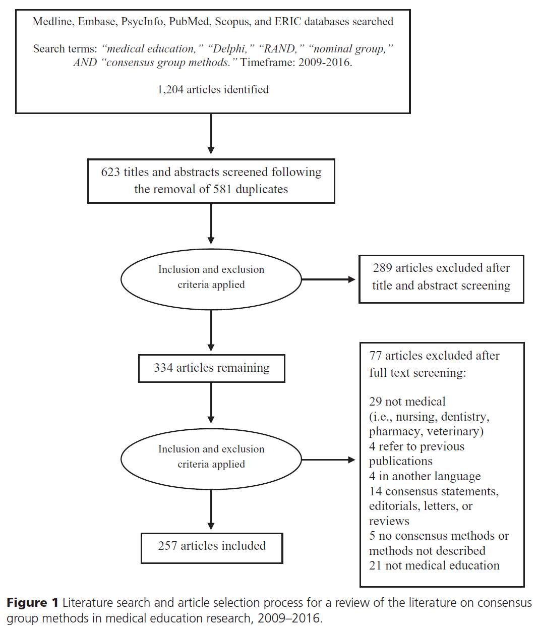 우리의 문헌 검색 결과와 논문 선정 과정(literature search results and article selection process)은 Figure 1에 예시되어 있습니다. 334편의 전문 논문(full-text articles)을 검토한 후, 257편의 논문이 우리 연구에 포함되었습니다. 이 논문들의 전체 참고문헌 목록은 http://links.lww.com/ACADMED/A461 의 Supplemental Digital Appendix 1을 참조하십시오.