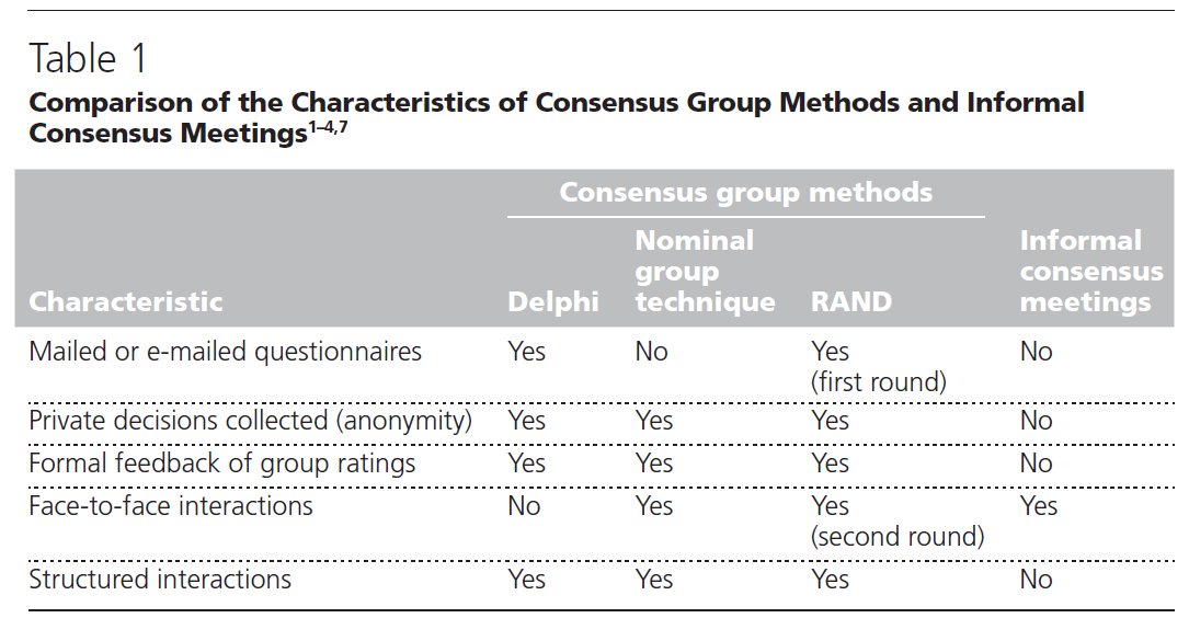 흔히 사용되는 두 가지 합의 방법은 델파이 기법(Delphi method)과 명목 집단 기법(nominal group technique, NGT)입니다. RAND Corporation과 UCLA David Geffen 의과대학에서 개발한 세 번째 방법인 RAND는 델파이와 NGT 방법의 하이브리드(hybrid)입니다. Table 1은 이 세 가지 접근 방식 간의 차이점 중 일부를 강조합니다.