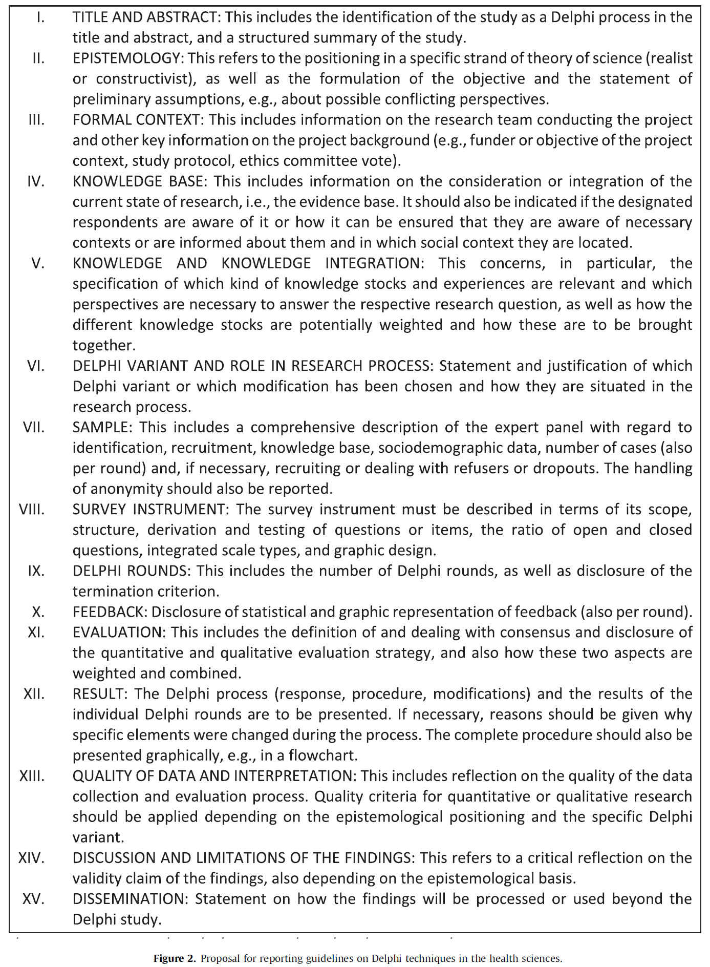 여기서 분석된 보고 지침은 보건 과학 분야의 델파이 연구와 관련이 있다. 식별된 어떤 보고 지침도 전체 델파이 과정(entire Delphi process)이나 델파이 변형의 스펙트럼(spectrum of Delphi variants) 또는 다양한 보건 과학 하위 분야에서의 가능한 적용(possible applications)을 포괄한다고 주장하지 않는다. 결과적으로 기준들은 엇갈리며(divergent), 오직 합의(consensus)라는 측면만이 모든 보고 지침에서 나타난다. 어떤 경우에는 보고 지침의 정보가 정보가 델파이 기법의 시작(beginning), 과정(process) 또는 결과(results) 중 어디를 참조하는지 명시되지 않아 부정확하게 공식화(imprecisely formulated)되어 있다. 특히 전문가 패널이나 설문지에 대한 정보는 델파이 연구 도중에 변경될 수 있다. 때로는 방법론적 결정(methodological decisions)이 언제 내려지거나 정의되어야 하는지가 불분명한 채로 남아있다. 이는 특히 선험적(a priori) 또는 후험적(a posteriori)으로 이루어질 수 있는 합의 정의(consensus definition)와 관련된다.