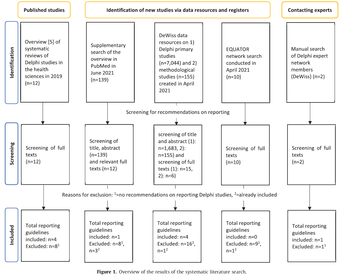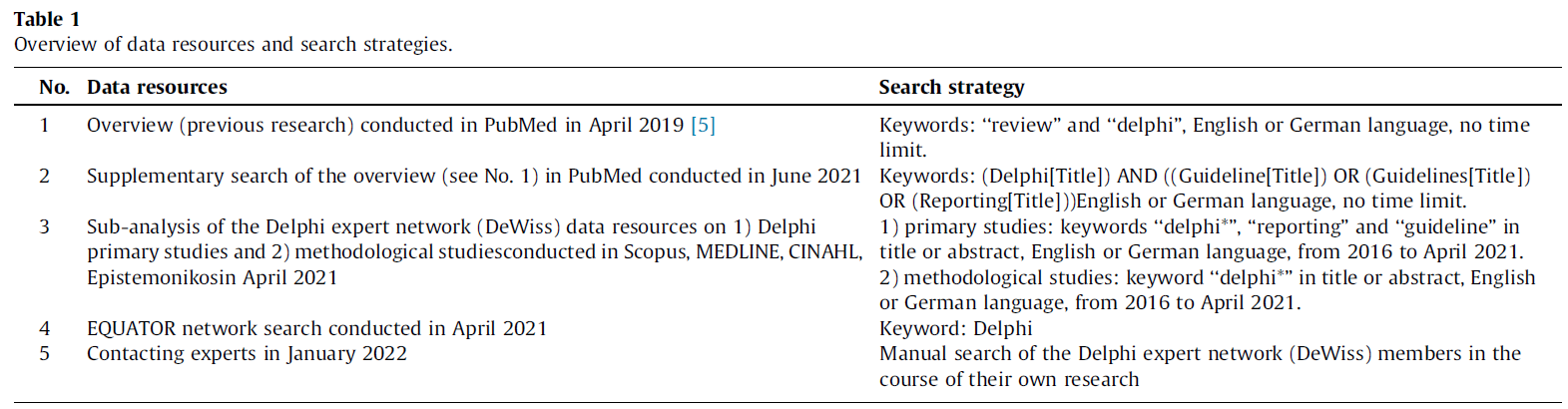 - 3. 2021년 4월 21일, 과학적 델파이 전문가 네트워크(scientific Delphi expert network) (https://delphi.ph-sg.de/)는는) 사회 및 보건 과학을 위한 중앙 데이터 자원(Scopus, MEDLINE, CINAHL, Epistemonikos)에서 델파이 연구에 대한 문헌 검색을 수행했다. 독일어권 과학 네트워크 DeWiss는 다양한 하위 분야와 인식론적 배경을 가진 20명의 연구자로 구성되어 있으며, 인식론적 기초(epistemological foundations), 방법론적 이슈(methodological issues), 그리고 델파이 연구의 실행 및 보고를 위한 지침에 초점을 맞춘다. 문헌 검색의 목표는 1) 델파이 일차 연구(Delphi primary studies)와 2) 델파이 기법에 관한 방법론적 연구(methodological studies)에 대한 두 개의 데이터 자원(data resources)을 생성하는 것이었다. 데이터 자원 구축을 위한 포함 기준(inclusion criteria)은 아래에 간략히 기술되어 있다. 델파이 연구가 포함된 원저 논문(Original papers)들은 6명의 연구자(MN, SD, JS)와 델파이 네트워크의 연구원들(MT, LS, XS)이 제목-초록 스크리닝(title-abstract screening)을 통해 두 번째 검토자(second reviewer)의 검증 없이 두 데이터 자원에 배정했다. 총 155편의 논문이 방법론적 연구 데이터베이스(2)에, 7,044편의 논문이 델파이 일차 연구 데이터 자원(1)에 배정되었다. 이번 연구에서는 두 데이터 자원에서 하위 분석(sub-analysis)이 수행되었다. 방법론적 연구 데이터 자원(2)은 연구원(MT)이 델파이 연구 보고에 대한 권고 여부를 제목-초록 스크리닝을 통해 검색했고, 잠재적으로 관련성이 있다고 간주된 문헌의 전문은 저자 중 한 명(JS)이 스크리닝했다. 필터링된 델파이 일차 연구 데이터 자원(1)(표 1 참조)은 n=1,683편의 논문으로 산출되었다. 잠재적으로 관련성이 있다고 간주된 논문의 제목, 초록, 전문은 저자 중 한 명(JS)과 연구원(XS)이 독립적이지 않게(not independently) 보고 권고 사항에 대해 스크리닝했다. 자신의 델파이 과정 결과만 보고하는 것으로 보이는 연구는 제외되었다.