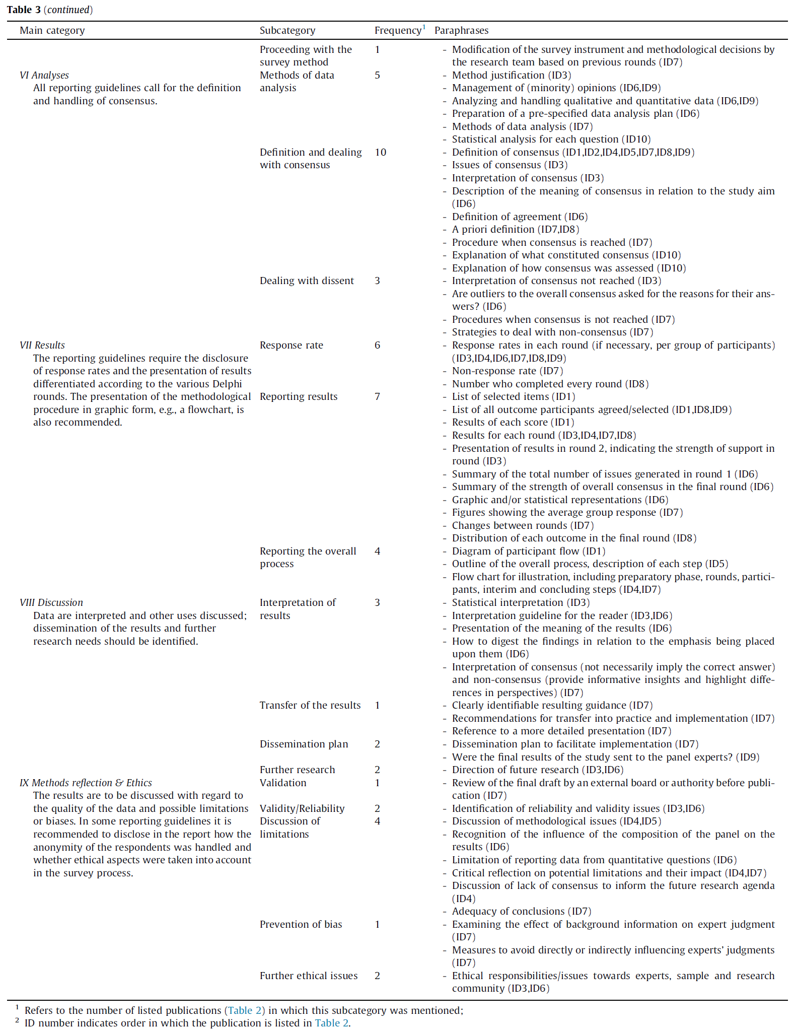 빈도(frequencies)는 일부 하위 범주가 단일 보고 지침에 의해서만 다루어지고 있음을 보여준다(ID 번호는 표 2에 나열된 출판물 순서를 나타냄):