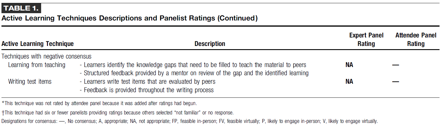 합의에 도달하지 못한 기법에 대한 패널들의 의견(Comments)은 대규모 그룹이나 가상 환경에서 어떻게 작동할지에 대한 불확실성(uncertainty), 학부 또는 대학원 교육에 더 적합한지에 대한 불확실성, 대규모 그룹 환경에서 참여하는 것에 대한 불편함(discomfort), 그리고 경쟁적인 환경(competitive environment)에 있고 싶지 않음 등을 기술했다.