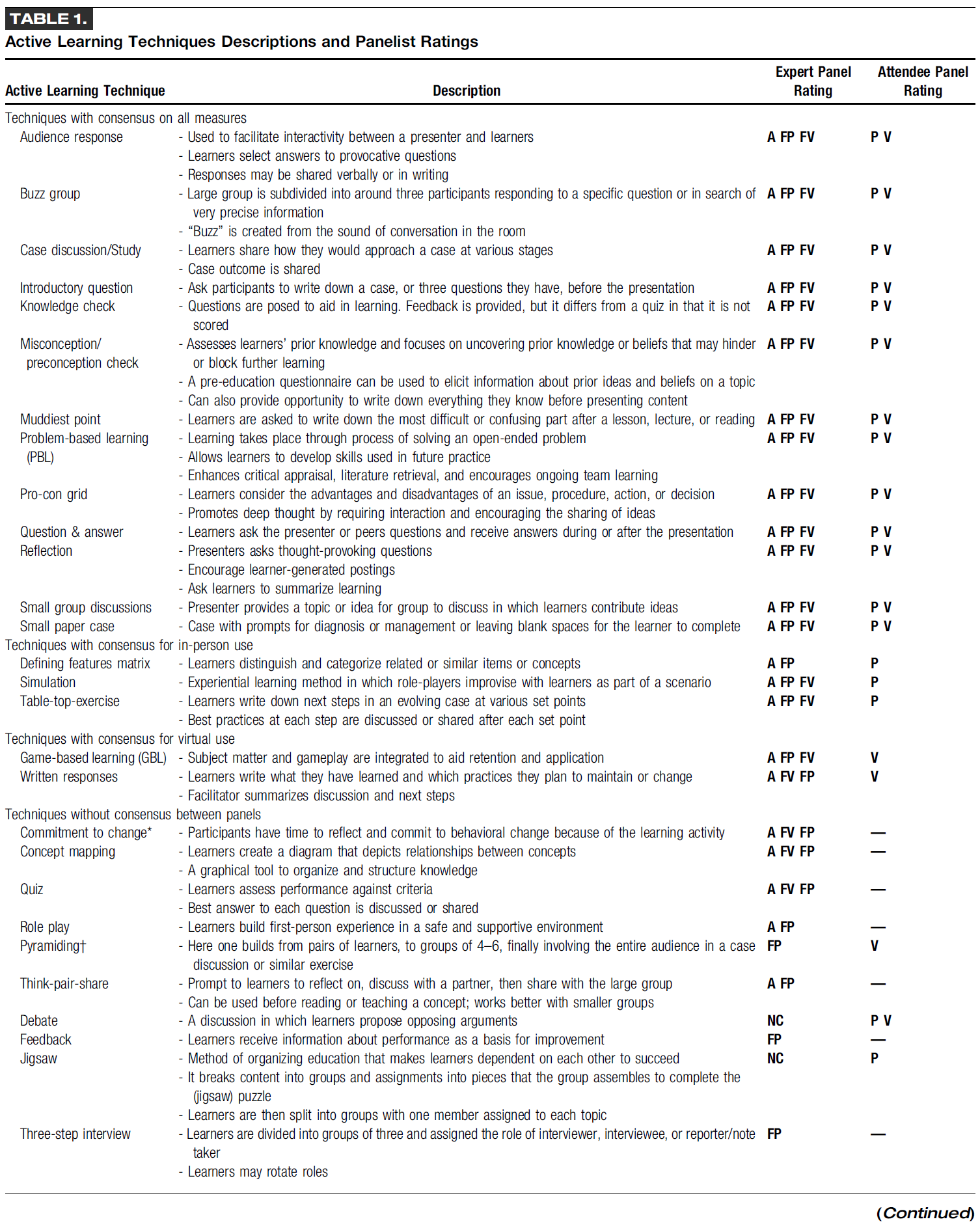 Beyond the Lecture: A Delphi Study of In-Person and Virtual Active Learning Techniques in Didactic Continuing Education