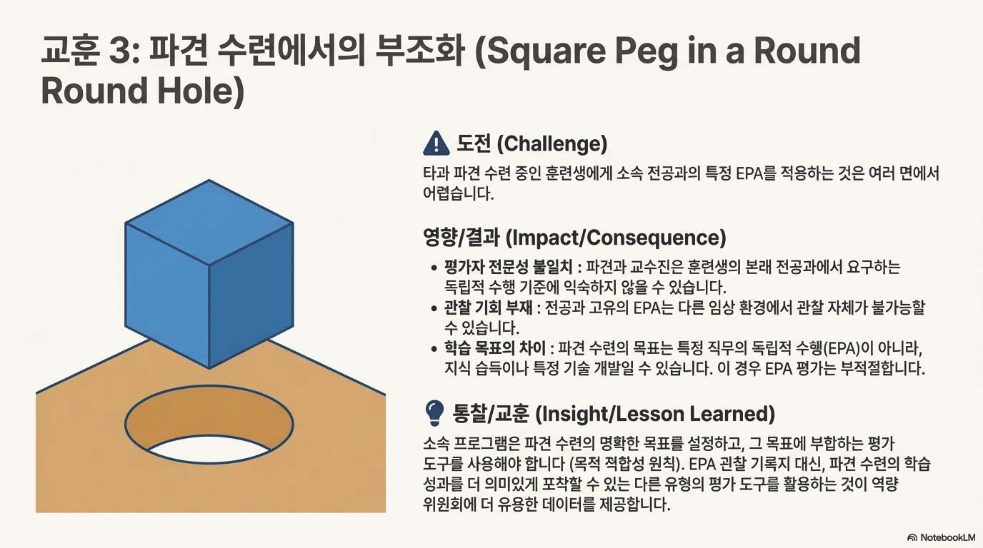 - 둘째, EPA는 전문 분야에 특화된 과업 (discipline-specific tasks)이므로 다른 임상 환경에서는 관찰되지 않을 수 있습니다. 일부 전문 위원회는 파견 로테이션에서 관찰되고 평가될 수 있는 EPA를 설계하는 데 신중을 기했지만 (deliberate), 이는 전문 분야 전반에 걸쳐 다양하게 고려되었습니다 (variably considered).
