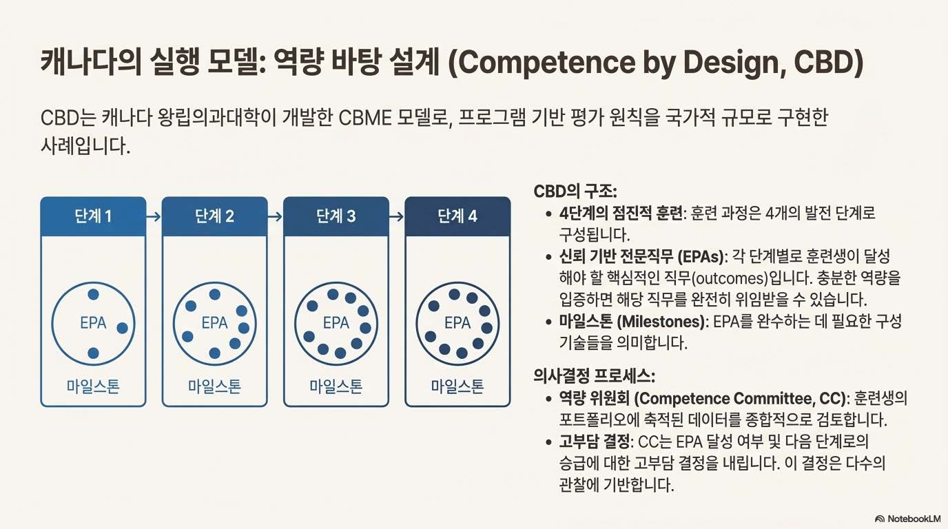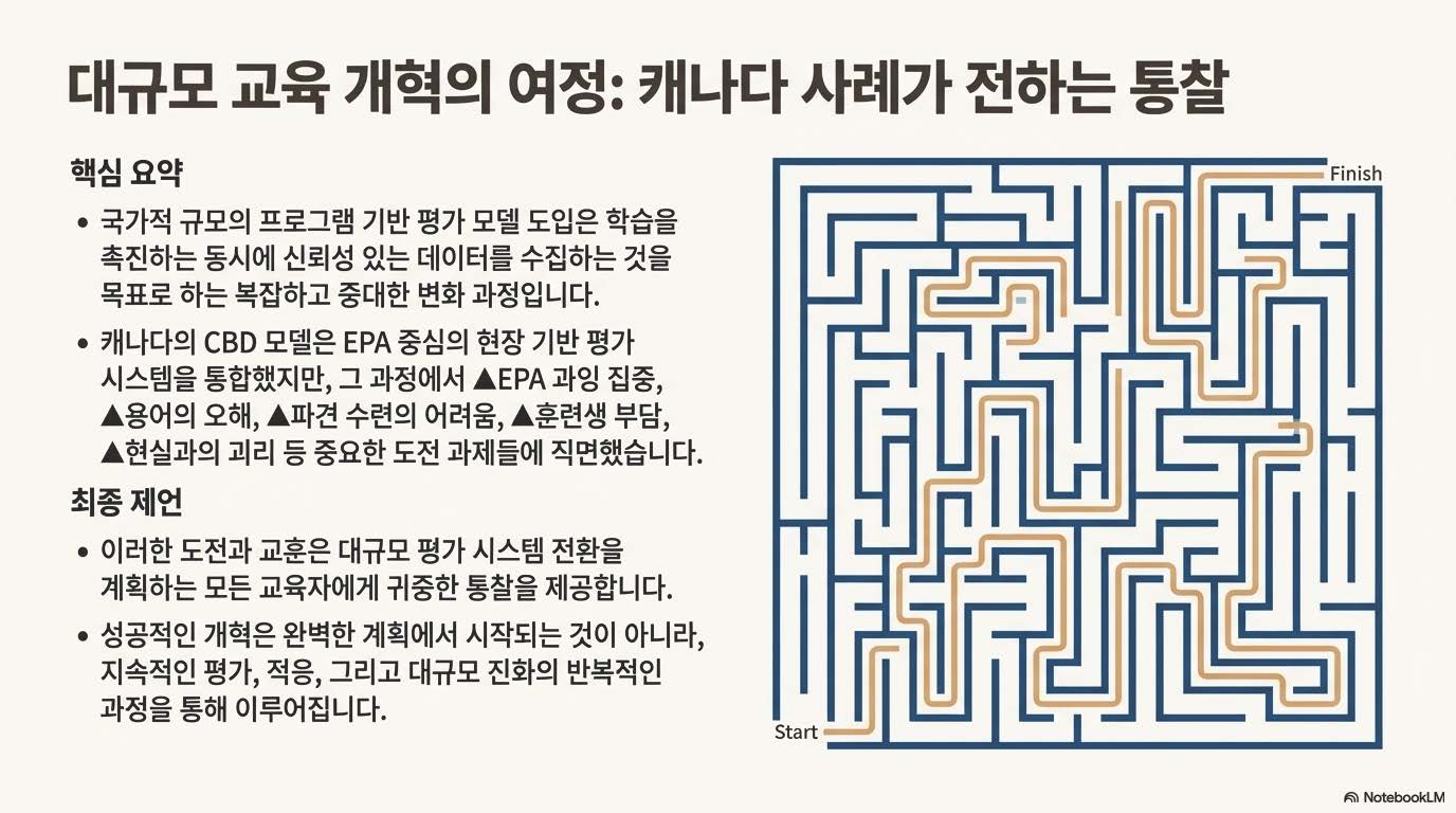 바로 캐나다 왕립 내과 및 외과 대학(Royal College)이 주도한 대규모 프로젝트, '설계에 의한 역량(Competence by Design, CBD)' 모델의 도입 과정과 그 교훈을 담은 논문 리뷰입니다. 전공의 수련 과정에 신뢰할 수 있는 전문 활동(Entrustable Professional Activities, EPAs)을 국가 차원에서 어떻게 접목했는지, 그리고 그 과정에서 겪은 시행착오는 무엇이었는지 함께 살펴보시죠! 🧐