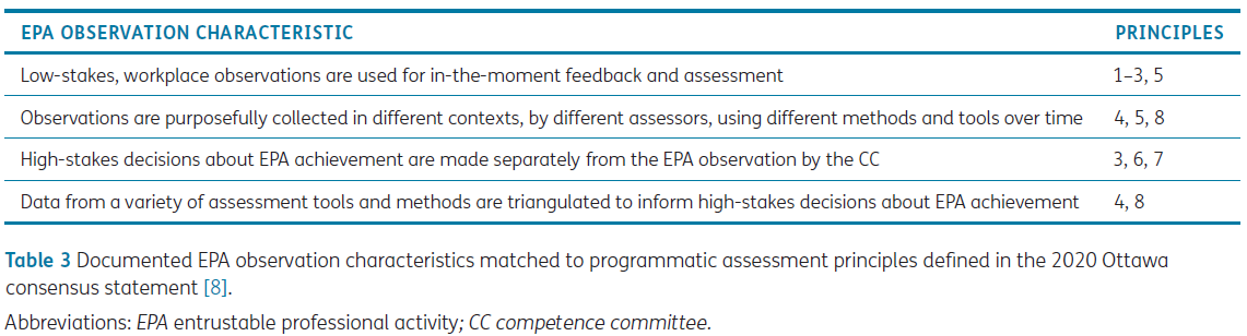 표 3. 2020 오타와 합의 성명서에 정의된 프로그램 평가 원칙과 매칭된 문서화된 EPA 관찰 특성 (Documented EPA observation characteristics matched to programmatic assessment principles defined in the 2020 Ottawa consensus statement [8].)