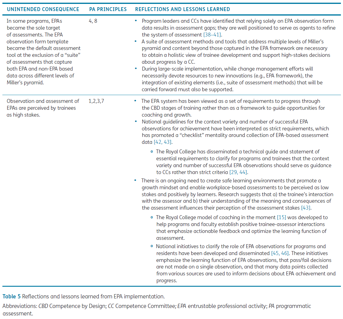 CBD의 설계 및 실행과 함께, 직장 바탕 평가 (workplace-based assessments)를 지도하기 위한 새로운 국가적 EPA 프레임워크 (new national framework of EPAs)가 도입되었습니다. 전문 위원회와 프로그램 책임자들 (program directors)은 일련의 CBD 워크숍 동안 그들의 국가적 EPA를 설계, 정제 및 수립하기 위해 상당한 시간과 노력을 투자했습니다 [37]. 게다가, 일선 현장 (on the front lines)에서는 활용과 참여 (uptake and engagement)를 강화하려는 목표로 프로그램, 교수진 및 피교육자들을 그들의 새로운 전문 분야별 EPA에 적응시키는 데 (on-boarding) 자원이 투입되었습니다 (dedicated). 이러한 노력은 각 전문 분야를 위한 새로운 국가적 역량 세트 (new national set of competencies)의 실행을 용이하게 하기 위해 필요했지만, EPA에 대한 인식된 강조 (perceived emphasis)는 프로그램 평가의 원칙에 도전하는 (challenge) 몇 가지 상호 관련된 그리고 의도하지 않은 결과들을 낳았습니다 (표 5).