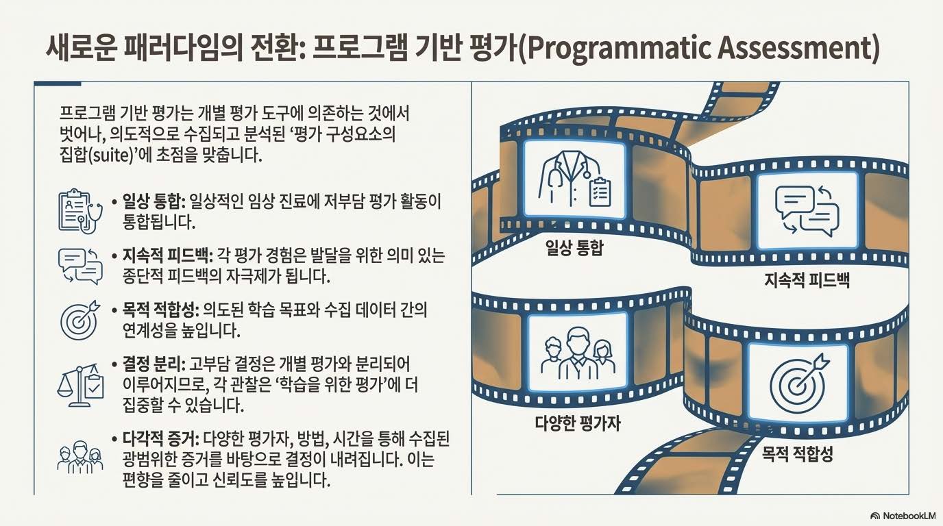 🗣️ 연구진의 의견: "프로그램 평가는 개별 평가 도구에 의존하는 것에서 벗어납니다; 대신 고부담 의사결정에 정보를 제공하기 위해 의도적으로 그리고 지속적으로 수집 및 분석되는 평가 구성 요소들의 “모음(suite)”에 초점을 맞춥니다." "Programmatic assessment shifts away from relying on individual assessment tools; it focuses instead on a “suite” of assessment components that are purposefully and continually collected and analyzed to inform high-stakes decisions."