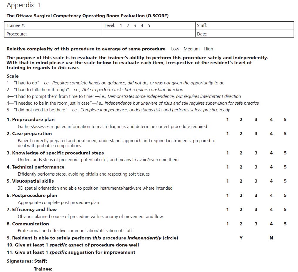 EPA는 즉각적인 관찰 및 코칭 피드백 (in-the-moment observation and coaching feedback)을 위한 목표물 (targets)로 기능하도록 설계되었습니다. 관찰된 과업에 대한 문서화 (Documentation)는 또한 CC가 EPA 성취에 대한 결정을 내리는 데 정보를 제공하기 위한 중요한 직장 바탕 평가 (workplace-based assessment, WBA) 데이터에 기여하도록 의도되었습니다. EPA 관찰은 일반적으로 EPA 관찰 양식 (EPA observation form) (그림 1)에 기록되지만, 프로그램들은 관찰을 기록하는 데 적합하다고 판단되는 어떠한 WBA 도구라도 사용할 수 있는 유연성 (flexibility)을 부여받습니다. EPA 관찰 양식 템플릿은 프로그램을 위한 자원 (resource)으로 개발되었으며, 수행에 대한 코칭 피드백과 판단 (judgments of performance)의 즉각적인 문서화를 용이하게 하도록 설계되었습니다. 이 관찰 양식은 RCEPA의 주요 특징 (key features)을 개요화하고 (outlines) 과업이 관찰된 구체적인 맥락 (specific context) (임상 환경, 환자 특성, 케이스 복잡성 등)을 문서화하도록 장려합니다. 지도전문의 (Supervisors)는 해당 임상 활동에 요구되는 감독 수준 (degree of supervision)에 근거하여 수행에 대한 단일한 포괄적 평정 (single global rating)을 제공하도록 요청받습니다. Royal College는 프로그램들이 다양한 임상 환경 전반에 걸쳐 강력한 심리측정적 특성 (strong psychometric characteristics)과 타당도 증거 (evidence of validity)를 입증한 O-SCORE 평정 척도 (rating scale)를 사용할 것을 강력히 권장했습니다 [18, 19, 20, 21, 22, 23]. 그러나, 프로그램들은 발달적 궤적 (developmental arc)을 따라 피교육자의 독립성 수준 (level of independence)을 나타내는 다른 회고적 감독 척도 (retrospective supervision scales)를 사용할 수 있는 지역적 유연성 (local flexibility)을 부여받았습니다 [24, 25]. 또한 각 EPA에 대한 이정표가 양식에 표시되어 지도전문의와 피교육자를 위해 과업을 “세분화 (breaking down)”함으로써 구체적이고 실천 가능한 (specific and actionable) 피드백 및 코칭 제공을 용이하게 합니다. 이러한 피드백을 문서화하기 위해 서술형 의견 섹션 (narrative comment section)이 포함되어 있습니다.