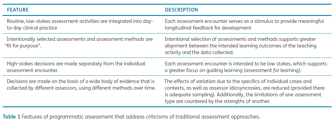표 1. 전통적인 평가 접근법에 대한 비판을 다루는 프로그램 평가의 특징 (Features of programmatic assessment that address criticisms of traditional assessment approaches.)