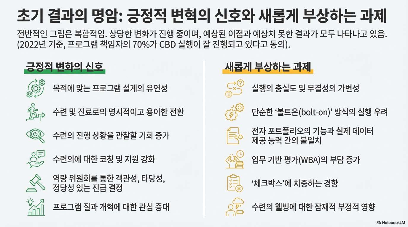 특히 위임 가능 전문 활동(Entrustable Professional Activities, EPA) 평가가 "체크박스 채우기"로 전락하거나, 전공의들이 교수님을 쫓아다니며(chasing) 서명을 받아야 하는 행정적 부담이 되었다는 지적도 있었습니다. 이는 오히려 전공의들의 웰니스(Wellness)를 해치는 결과로 이어지기도 했고요.