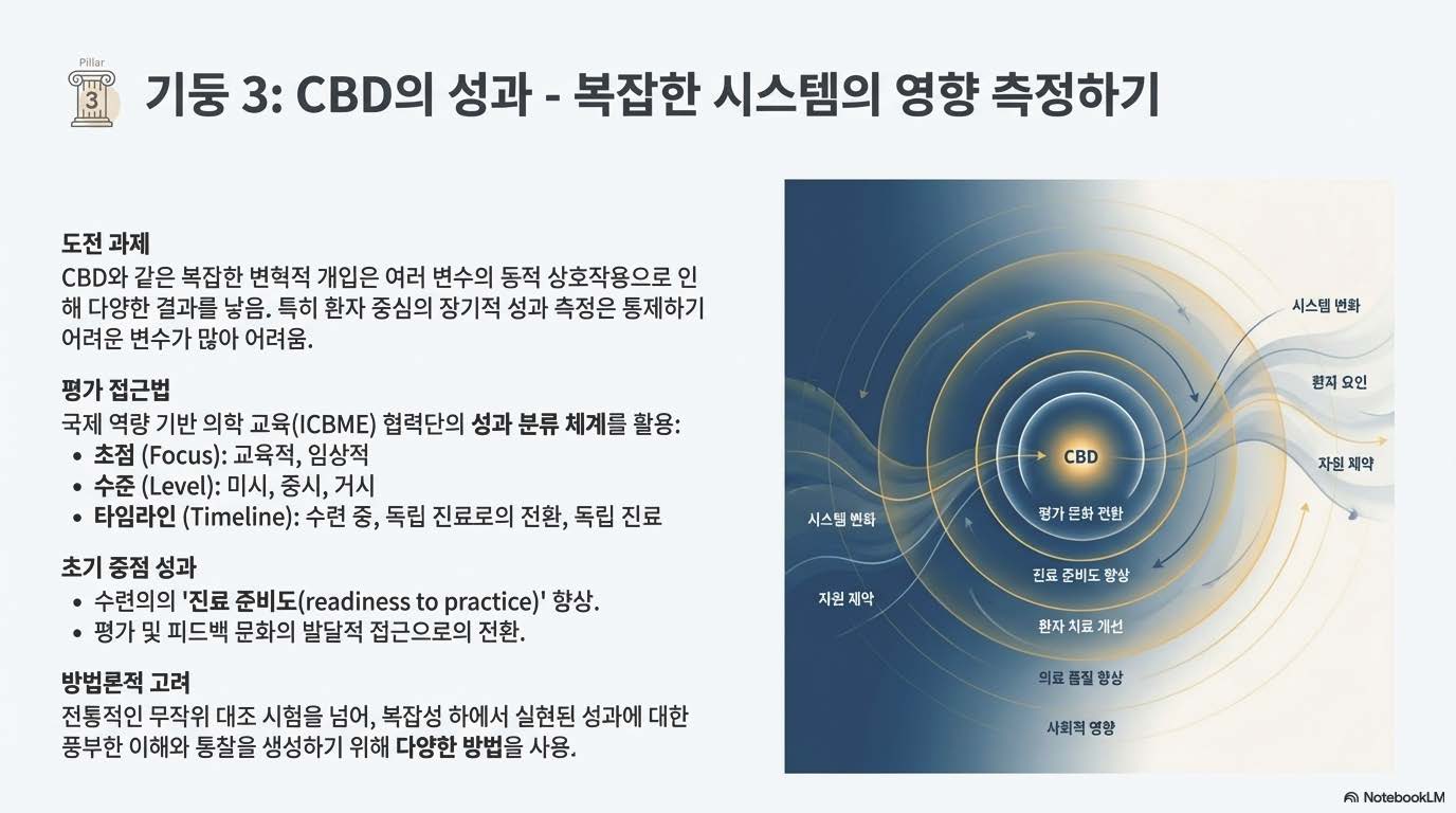 캐나다 왕립 내과 및 외과 대학(Royal College)이 주도한 CBD는 전공의 교육을 시간 중심에서 역량 바탕 의학 교육(Competency-Based Medical Education, CBME)으로 완전히 뜯어고치는 대규모 프로젝트였죠.