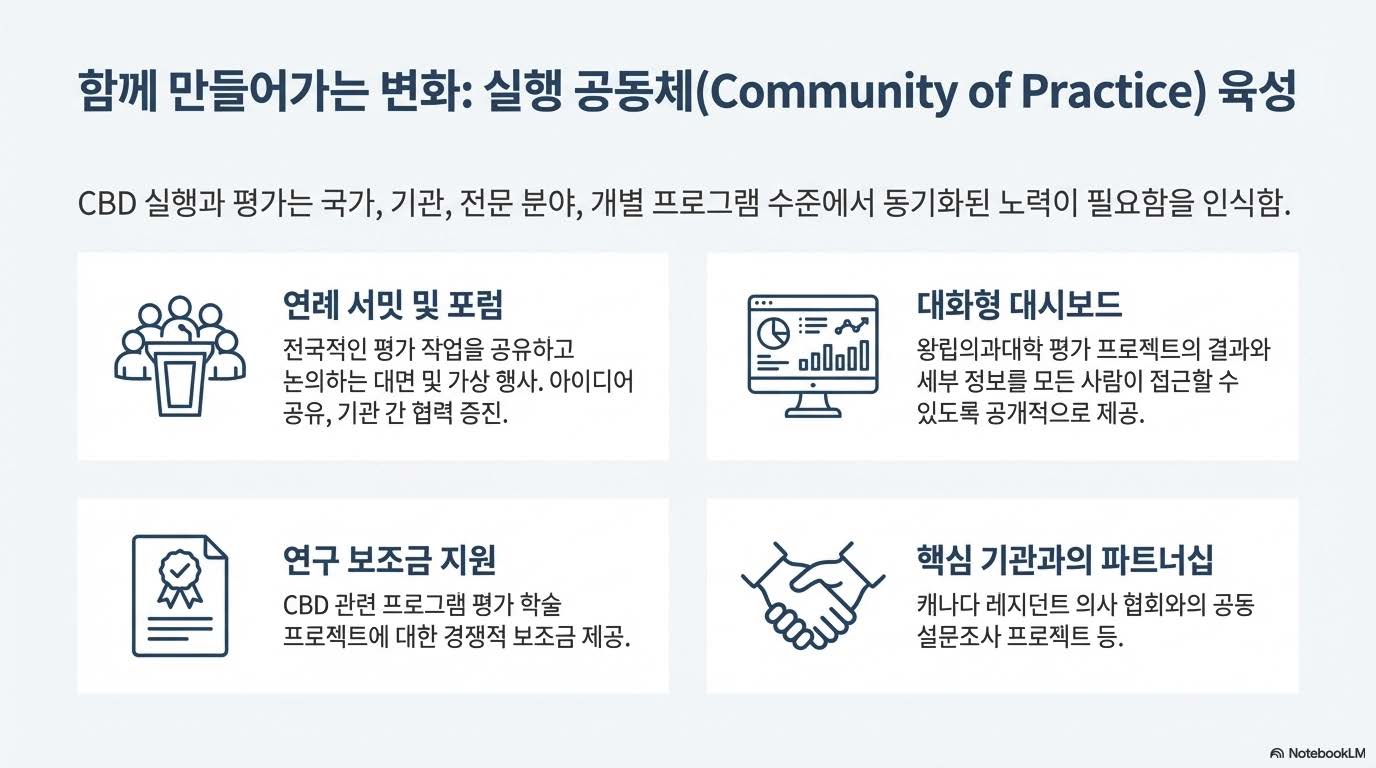 CBD는 전환적 변화(transformative change)를 위한 활용 중심 프로그램 평가 전략(utilization-focused program evaluation strategy, CBD-PES)에 대한 상당한 투자 및 헌신과 결합된 대규모 국가적 변화 이니셔티브입니다. 변화의 본질과 그 영향에 대한 이해가 진화함에 따라, 지속적인 평가와 수정의 순환(continuous cycles of evaluation and adaptation)은 전환 과정을 더욱 집중시키는 데 도움이 될 것입니다. CBD 로직 모델과 평가의 세 가지 기둥인 실행 준비도(readiness to implement), 실행의 충실도와 진정성(fidelity and integrity of implementation), 그리고 실행의 성과(outcomes of implementation)에 기반을 둔(Grounded in) PES는 지금까지 가치 있는 통찰력을 제공해 왔습니다. 투자된 그룹들과 교류하고(Engaging with invested groups) 이 변화를 중심으로 실천 공동체를 육성하는 것은 결정적이었습니다(critical). 도전과제의 조기 식별과 의도하지 않은 성과의 감지, 그리고 CBD 실행의 충실도와 진정성에 대한 우려 신호는 이미 중요한 수정(important adaptation)을 낳았으며 의학교육에서의 CBME 실행과 변화에 대한 우리의 이해에 기여했습니다. CBD PES는 Royal College가 향후 CBD의 진화를 이끌어갈 수 있는 좋은 위치에 있게 하며(positions... well), 이상적으로는 전 세계의 다른 대규모 전환적 변화 이니셔티브와 모든 CBME 실행에 정보를 제공하는 데 도움을 줄 수 있습니다.