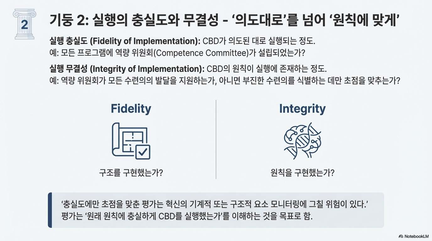실행의 충실도(Fidelity of implementation)는 CBD가 의도된 대로 실행되고 있는 정도(degree to which CBD was being implemented as intended)로 정의되었습니다 [31]. 이 개념은 실행의 진정성(integrity of implementation) [32]과 밀접하게 관련되어 있는데, 진정성은 충실도를 넘어 실행에 있어 CBD의 원칙들이 존재하는 정도(degree to which the principles of CBD were present)를 식별하는 것입니다. 이 구분의 중요성은 임상 역량 위원회(clinical competence committees, CCs)의 채택을 조사한 Hauer 등의 연구에서 잘 묘사되어 있습니다 [33].