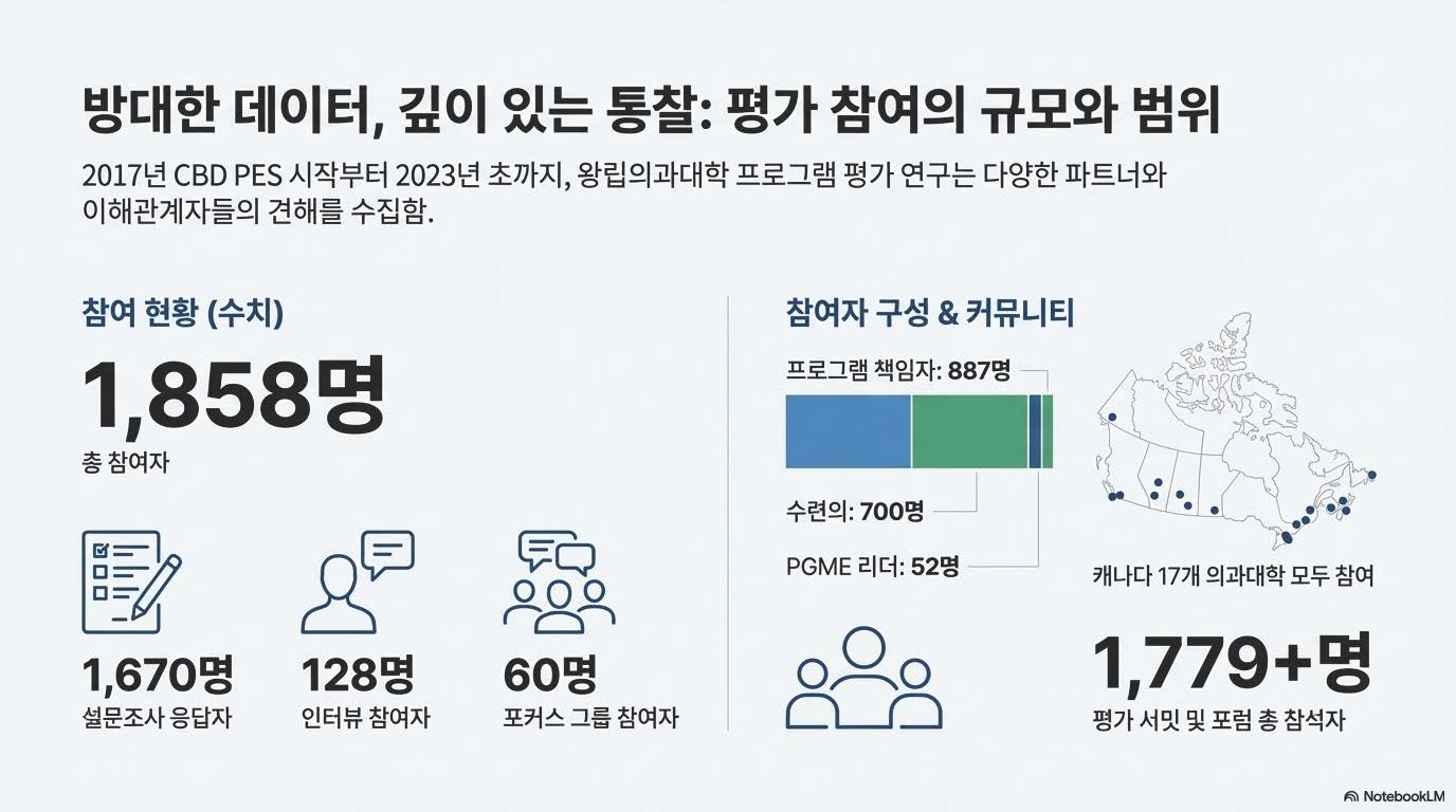 2017년 CBD 프로그램 평가 전략(PES)의 시작부터 2023년 초 집필 시점까지, Royal College 프로그램 평가 연구들은 1,670명의 설문 응답자, 128명의 인터뷰 대상자, 60명의 포커스 그룹 참가자를 포함하여 1,858명의 파트너 및 투자된 다른 사람들의 견해와 관점(views and perspectives)을 포착했습니다 [48]. 참가자들에는 887명의 프로그램 책임자, 700명의 수련생, 그리고 캐나다 내 17개 모든 의과대학의 52명의 전공의 교육(PGME) 리더들이 포함되었습니다. 프로그램 평가 서밋 및 포럼을 포함한 지역사회 참여 작업(community engagement work)을 통해, 91개의 초록과 20개의 기조연설(plenaries)이 총 1,779명이 넘는 청중에게 발표되었습니다. 투자된 파트너 참여(invested partner engagement)의 범위는 다양성과 규모(diversity and magnitude) 면에서 상당했습니다.