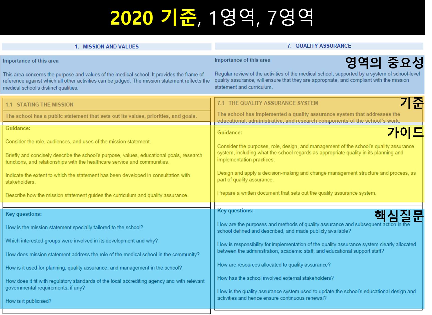 ▶ 2020기준의 8개 영역: 1. Mission and values; 2. Curriculum; 3. Assessment; 4. Students; 5. Academic staff; 6. Educational resources; 7. Quality assurance; 8. Governance and administration