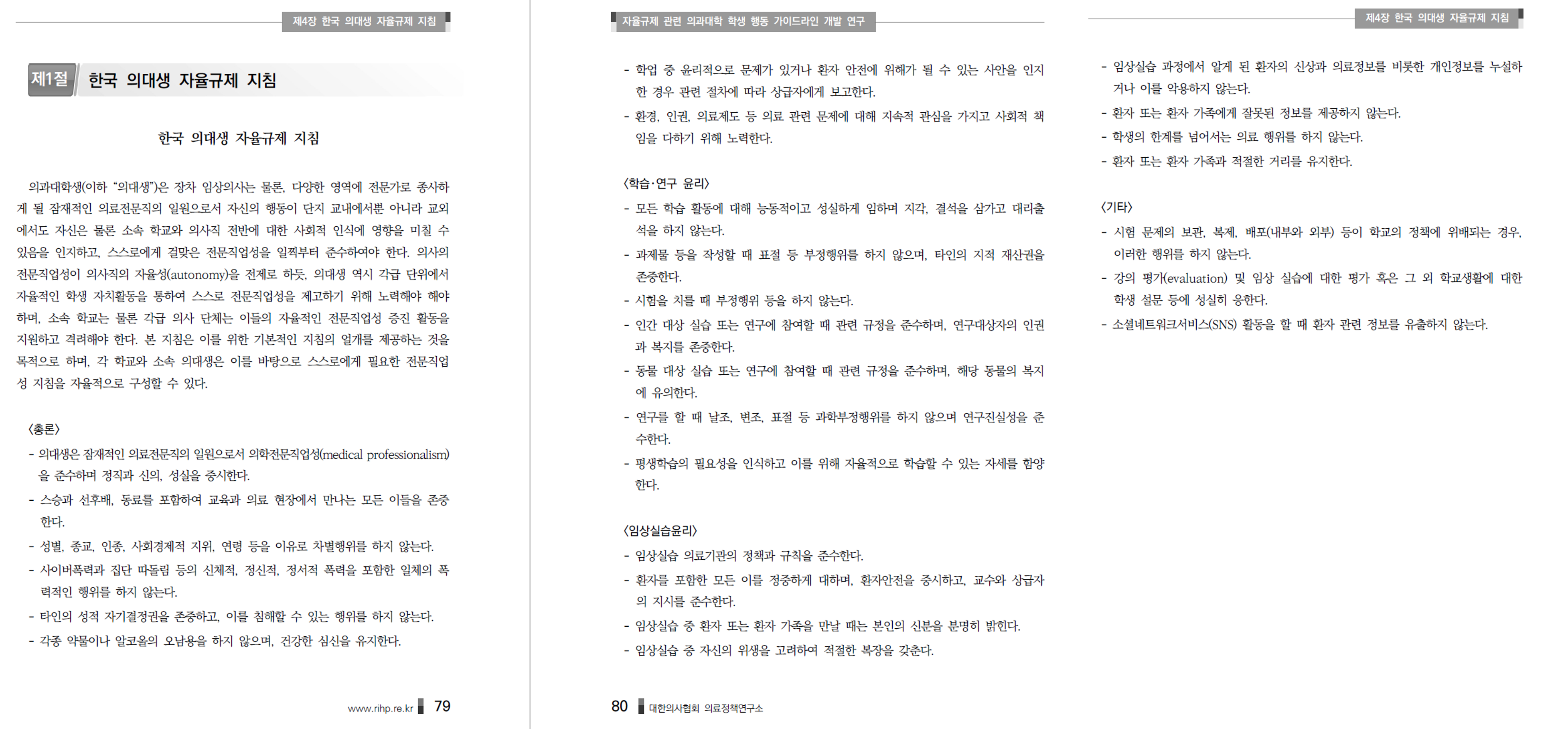 마지막으로, 이 보고서가 나오기 전에 자체적으로 행동강령을 개발하고 도입해온 학교들의 경험은 눈여겨 볼 만 하다. 연구보고서의 온라인 공청회 녹취록에 고려의대와 울산의대의 진솔한 경험이 잘 정리되어 있다. 고려의대에서 “고려의대 행동규범 서약”에 대해 모든 학년 학생이 매 학기 반복적으로 6년 동안 하도록 운영한다는 것과, 고려의대와 울산의대 공히 학생에 대한 행동규범을 도입할 때 학생들은 “교수님들은 자율규제(행동강령) 있어요?”라는 의문이 담긴 반발과 저항이 있음을 눈여겨 볼 만 하다.
