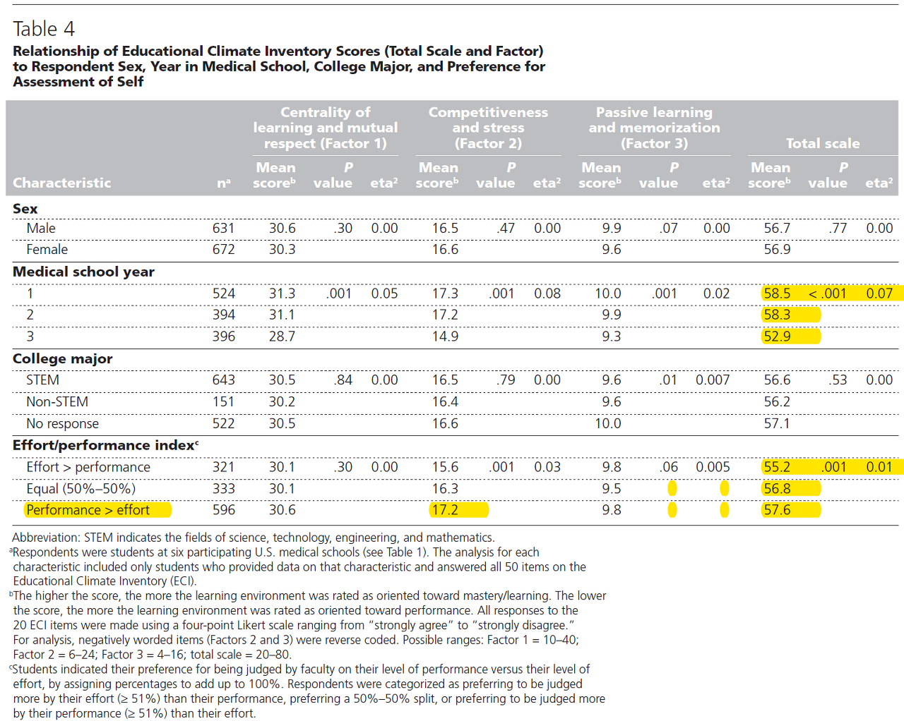 응답자 성별이나 대학 전공에 따른 총점 차이는 없었다. 임상실습 학생들이 더 성과(performance) 지향적이라고 생각했다. 성과지향적이라고 느낀 학생들이 자기 의과대학에 대한 만족도가 더 낮았고, medicine이라는 커리어에 대한 만족도가 낮았다. 전임상 학생들은 노력보다는 성과로, 임상실습 학생들은 성과보다는 노력으로 평가받기를 원했다. 즉, 전임상 경험보다 임상실습 경험이 더 성과performance 지향적이라고 평가했으며, 전임상 학습에서 grade 시스템인 경우에 더 성과performance 지향적이라고 느꼈다.